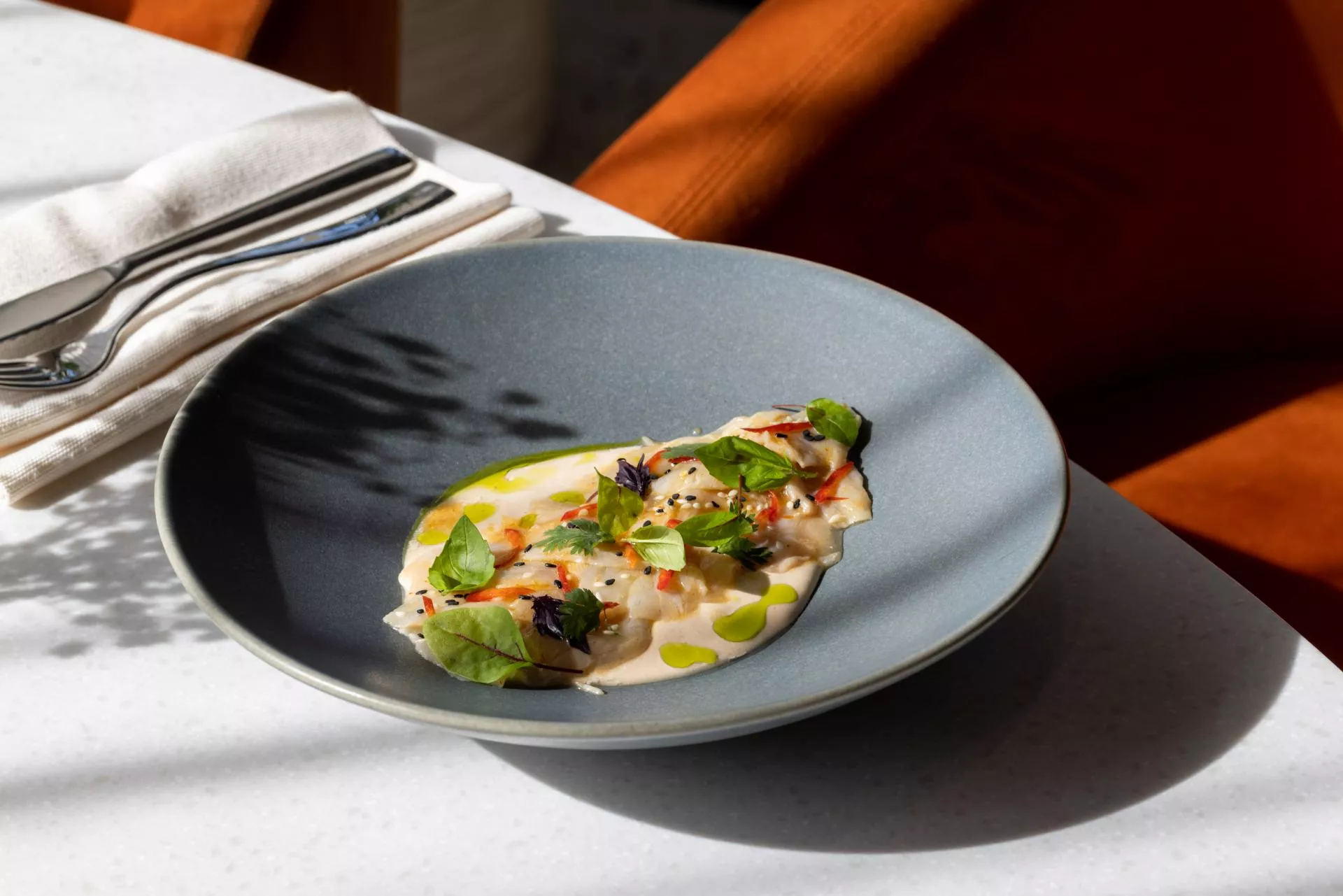 Ресторан расположен на первом этаже апарт-отеля. Стильный дизайн, в котором преобладают светлые оттенки и натуральные материалы, создают в нем особую уютную атмосферу.