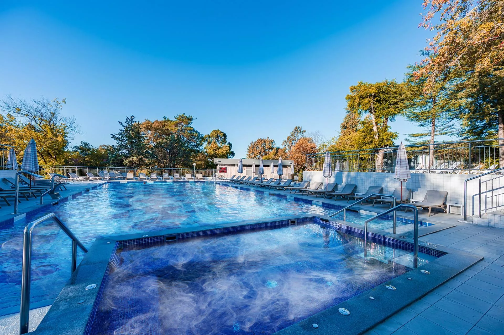 Открытый гидромассажный бассейн предназначен для проведения релаксационных гидромассажных процедур. Бассейн оснащен системами гидромассажа (лежаки, сиденья), прожекторами для подводного освещения.